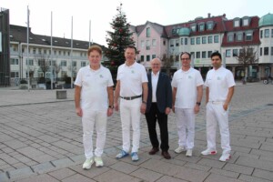 Dr. Frank Wellmann, Geschäftsführer der Krankenhaus St. Josef gGmbH (Mitte), freut sich, die vier Orthopäden der Praxisklinik Werneck – (v.l.n.r.) Dr. med. Michael Klug, Priv. Doz. Dr. med. Bernd Baumann, Dr. med. Florian Schneider und Dr. med. Yama Kamawal – ab Januar 2026 als neue Belegärzte in Schweinfurt begrüßen zu können.