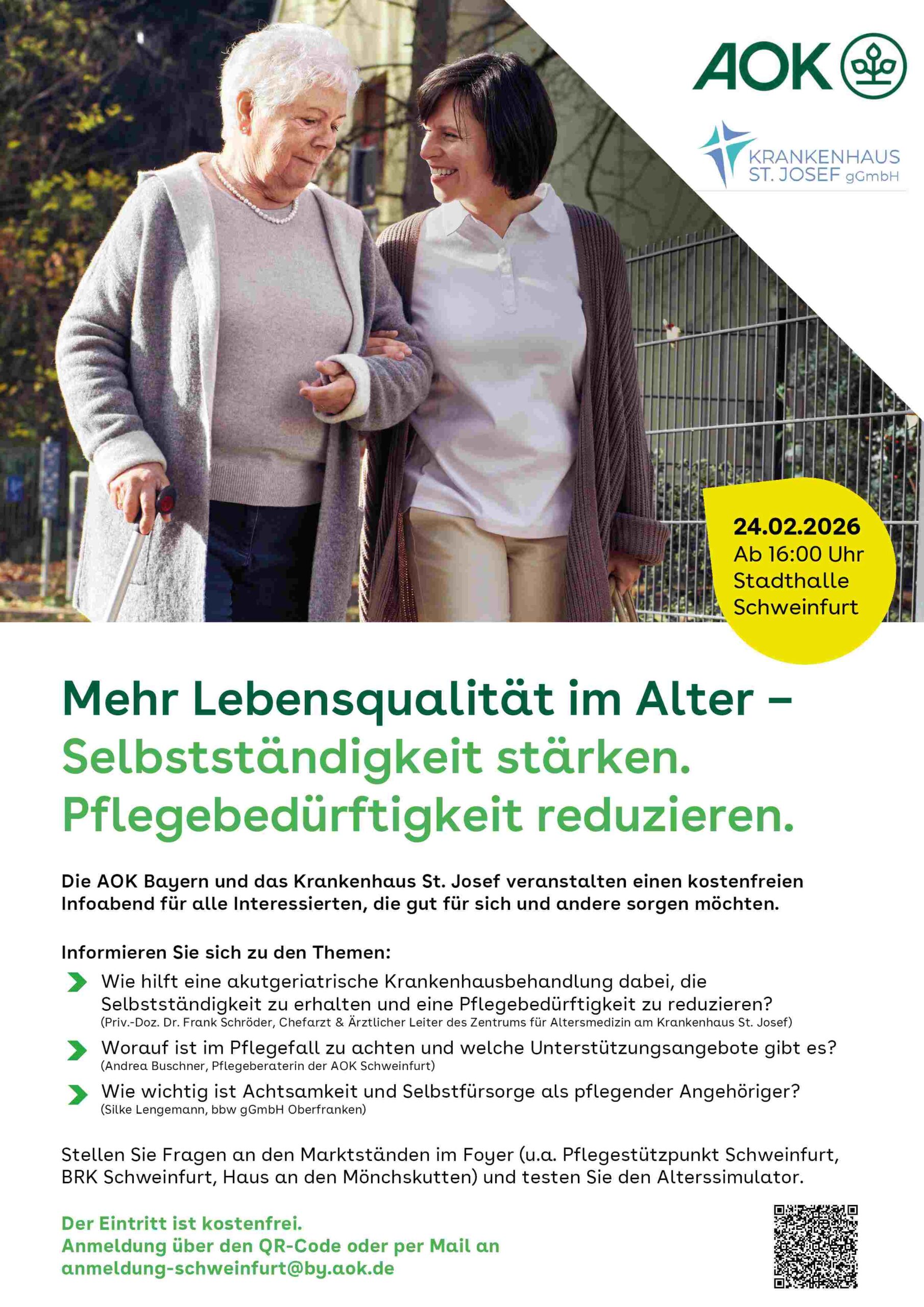 Gesund alt werden – das wünscht sich jeder. Doch mit der steigenden Lebenserwartung wächst für viele Menschen auch die Sorge, ihre Selbstständigkeit durch körperliche oder kognitive Einschränkungen zu verlieren. Unter dem Titel „Mehr Lebensqualität im Alter – Selbstständigkeit stärken. Pflegebedürftigkeit reduzieren.“ laden die AOK Bayern und das Krankenhaus St. Josef am Dienstag, den 24. Februar 2026 ab 16 Uhr in die Stadthalle Schweinfurt zu kurzweiligen Expertenvorträgen ein.